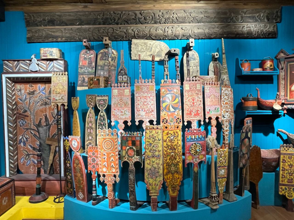 В Музее народного искусства вы увидите как крестьяне украшали свою повседневную жизнь — резное и расписное дерево, наружную домовую резьбу, стенные росписи, сундуки, предметы быта и орудия труда, превращённые мастерством в произведения искусства. Заказав экскурсию, можно на полтора часа погрузиться в живую атмосферу крестьянского мира — удивительно тонкого, яркого и изобретательного. Вы увидите прялки, украшенные сусальным золотом и темперной росписью, инкрустированные морёным дубом. Поищите грифона, тритона, льва и голову дракона. А на задней стенке простого крестьянского шкафа можно найти образ домового или кикиморы. Здесь же — народные иконы в разных техниках, редчайшие пряничные и набойные доски, а также поддужные колокольчики, каждый из которых звучал по-своему.